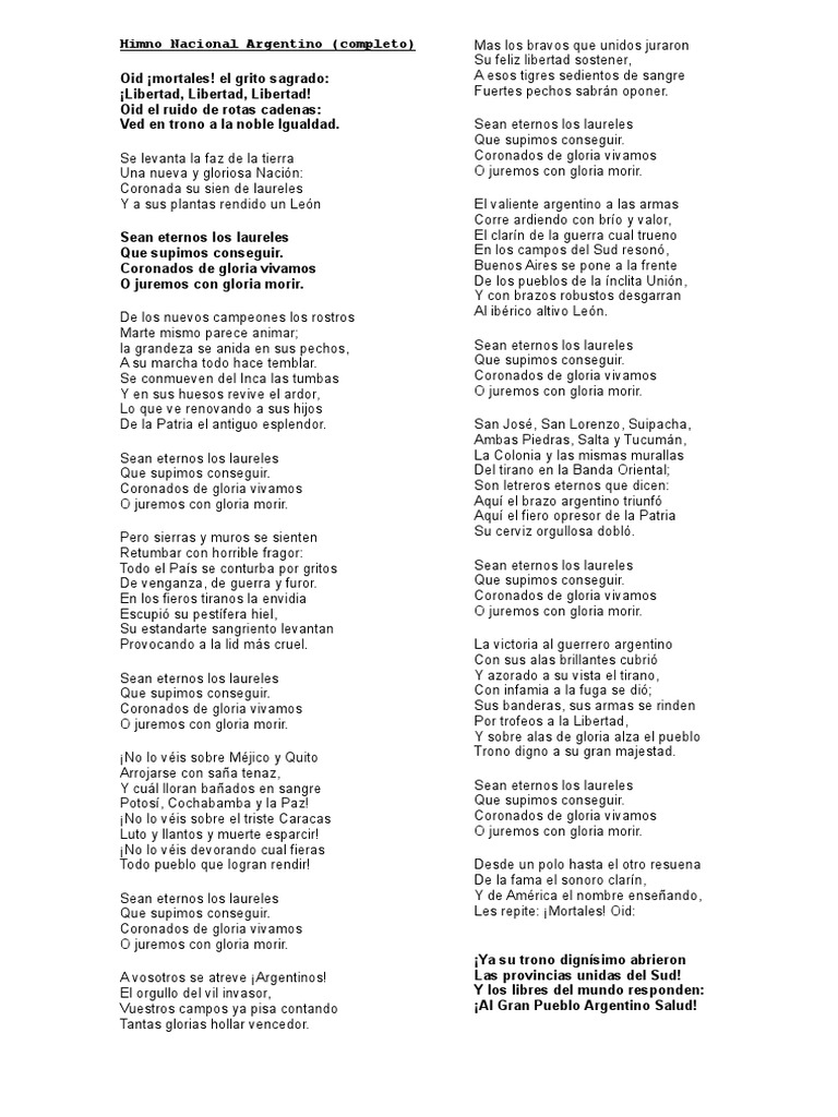 Al gran pueblo argentino, ¡salud! La versión original tiene un coro y nueve estrofas, cada una formada por dos cuartetas decasílabas. Coronada su sien de laureles, y a sus plantas rendido un león. Oíd, mortales, el grito sagrado ¡libertad, libertad, libertad! Lunes, 6 de junio de 2016.